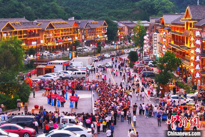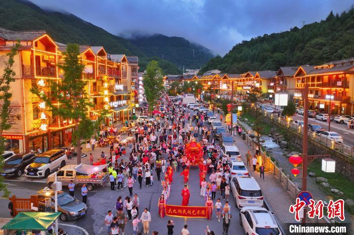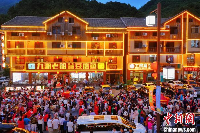 近日,傍晚时辰,湖北神农架大九湖坪阡古镇灯火通后,搭客在镇上失业、分布,享受夏令阴凉。大九湖湿地公园平均海拔1700多米,是华中地区唯独保存较无缺的亚热带亚峻岭泥炭池沼湿地。进程多年的保护和发展,大九湖湿地获得疗养繁殖,坪阡古镇也迎来了更多前来避暑的搭客。图为到坪阡古镇旅游的搭客不雅看献艺。周星亮摄