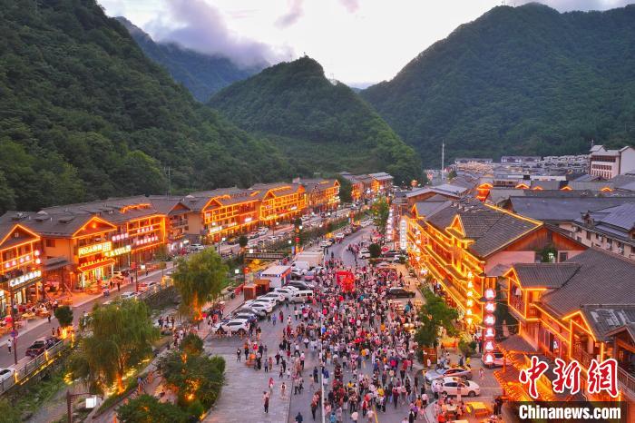 近日,傍晚时辰,湖北神农架大九湖坪阡古镇灯火通后,搭客在镇上失业、分布,享受夏令阴凉。大九湖湿地公园平均海拔1700多米,是华中地区唯独保存较无缺的亚热带亚峻岭泥炭池沼湿地。进程多年的保护和发展,大九湖湿地获得疗养繁殖,坪阡古镇也迎来了更多前来避暑的搭客。图为位于大山深处的坪阡古镇。周星亮摄