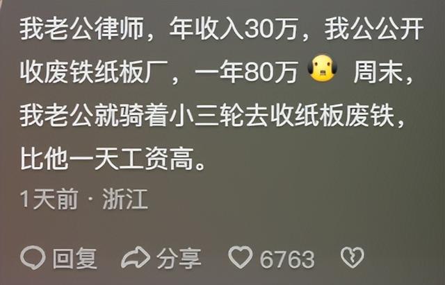 周末你老公还骑着小三轮去赞理收纸板废铁,一天的收入比他辽远的工资还高,哈哈哈哈哈