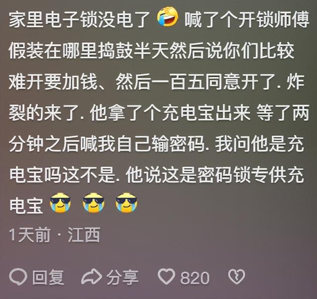 这开锁师父也确凿够“机智”的,这种操作王人能想出来。。下次如若再际遇这种情况,可以计议先我方找找有莫得备用的电板或者充电宝,或者多相比几家开锁奇迹,望望哪家更靠谱、更专科[泪奔]
