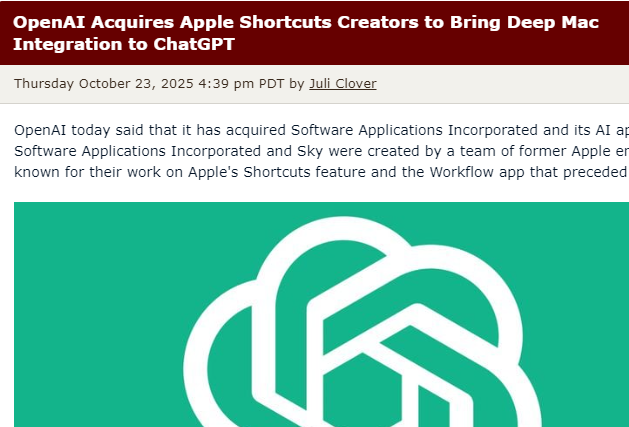 【全球网科技详细报谈】在推出对标Safari和Chrome的浏览器ChatGPT Atlas只是一天后,OpenAI再出重拳,于10月23日晓示收购由前苹果中枢职工创立的Software Applications Incorporated公司过头AI运用Sky。外媒MacRumors指出,这一收购被视为OpenAI构建桌面AI生态的关节一步。